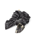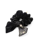 This scrunchie features a glossy velour fabric and embroidered lace, creating a gorgeous back view.